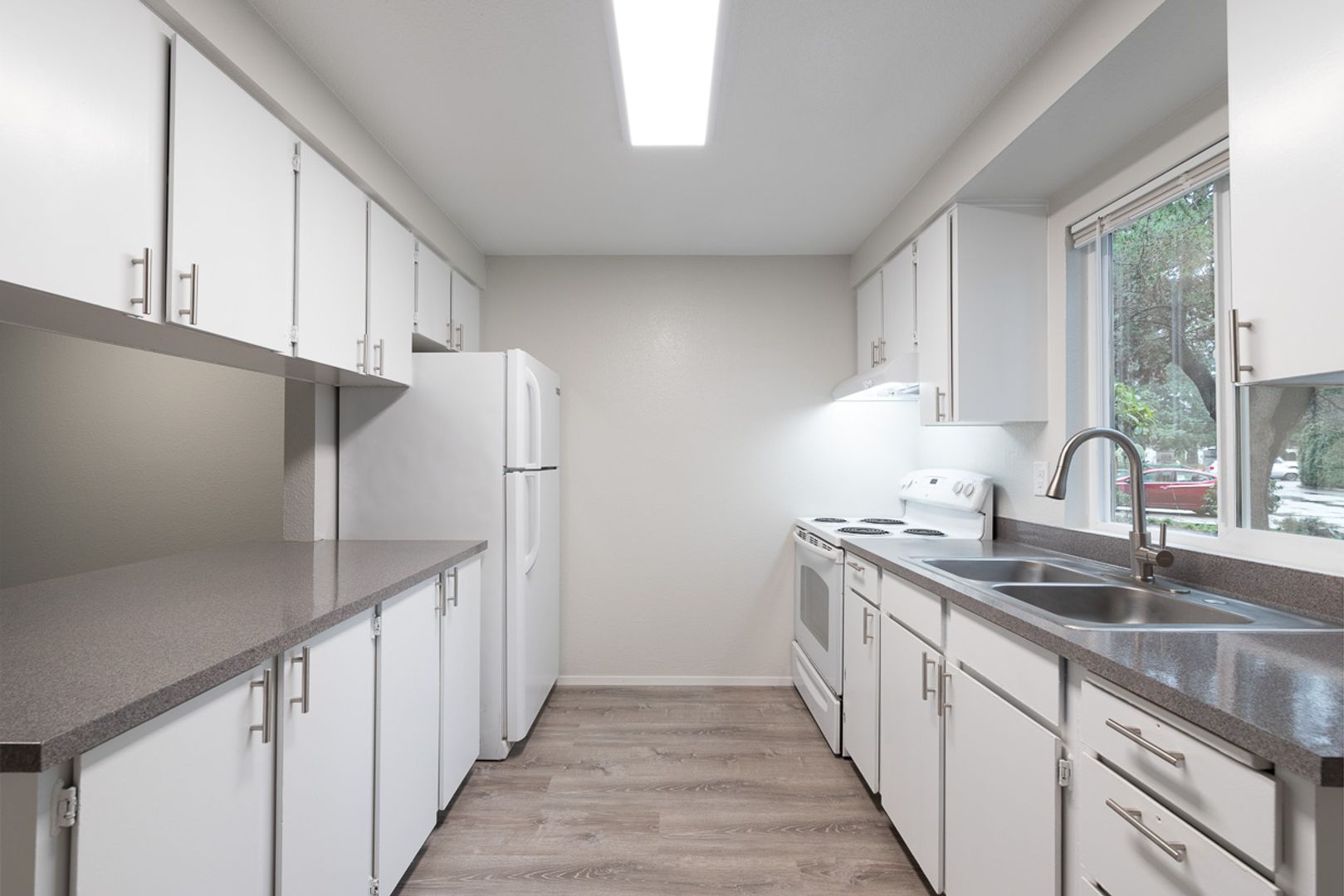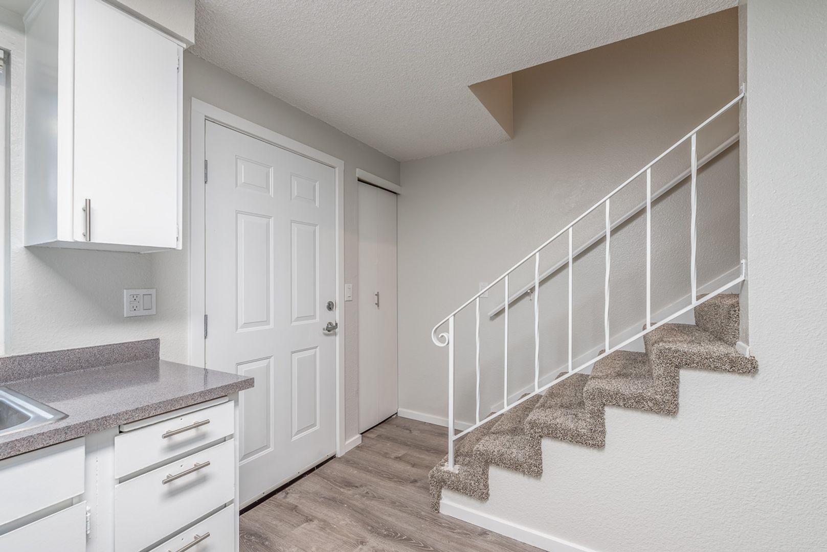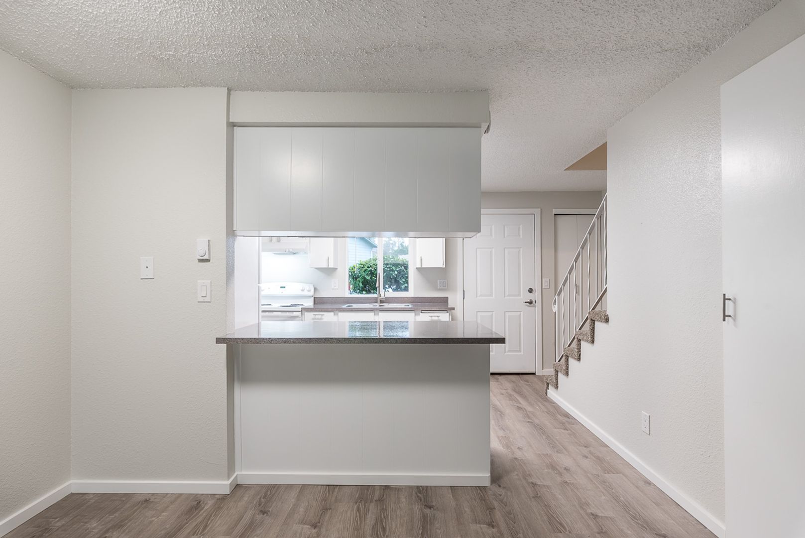 Our well-maintained 24-unit community is managed by a dedicated team that prides itself on providing exceptional service, ensuring you feel at home from the very first day. Enjoy modern living with a variety of fantastic amenities, including on-site laundry (you no longer need to worry about buying costly appliances or searching for a laundromat) and guaranteed parking for all residents. Each home is unique and charming but full of stylish modern features. This unit has carpeted stairs and bedrooms to keep things serene inside. The downstairs living room and kitchen feature hardwood-like luxury plank flooring and sleek new countertops. Sliding glass doors from the living room lead out back to a nice outdoor area.