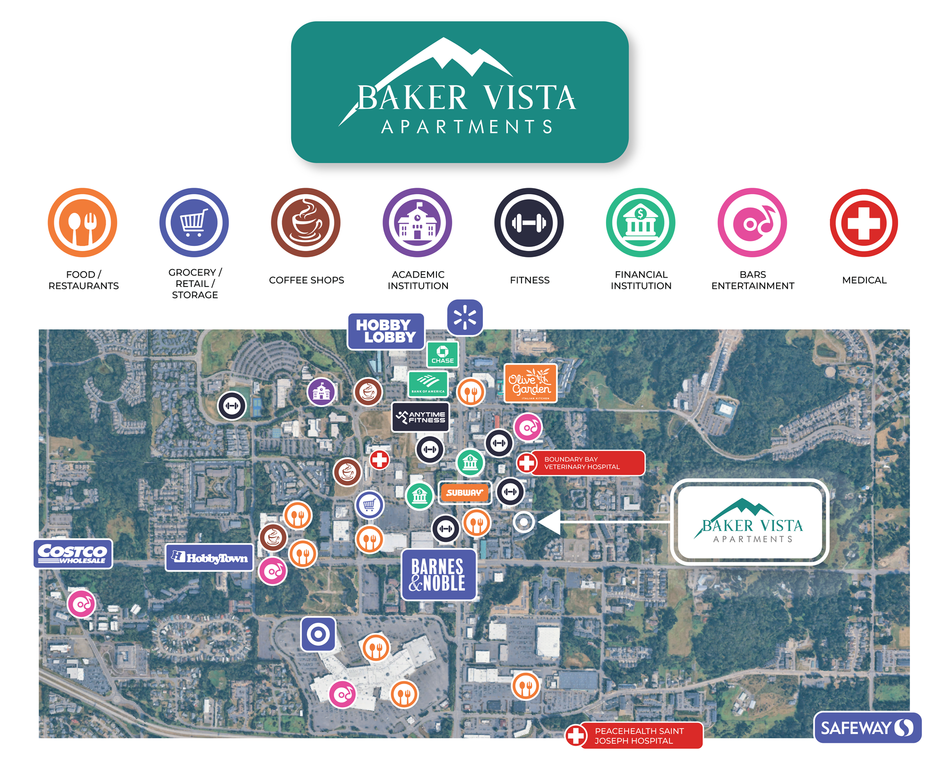 Ideally situated near I-5, Whatcom Community College, and the shopping-packed Meridian retail corridor, and within four miles of Downtown Bellingham, Baker Vista puts you within reach of it all!